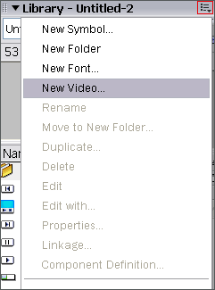 Door middel van actionscript kunnen we ook een video bedienen. Hiervoor moeten we allereerst, de link naar het video bestand, toevoegen aan de Library . Dit doen we, door in de linker bovenhoek van het Library scherm, te klikken en New Video te selecteren.